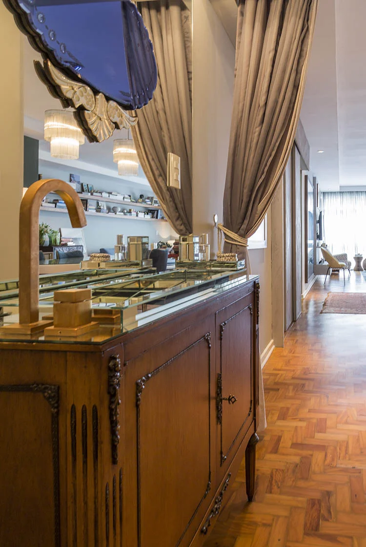 No lavabo, que não poderia ser usual, um móvel antigo recebeu uma inusitada cuba de espelho.