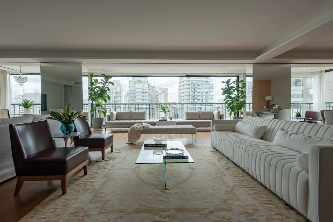 Ao integrar a varanda ao grande living, criamos espaço para a área de jogos e um lounge de vinhos, sem deixar de lado a circulação fluida.